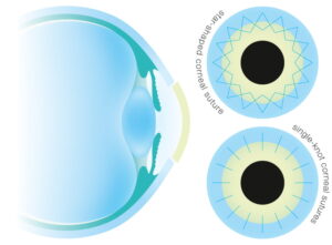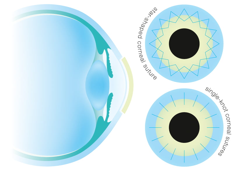 The fine sutures used for suturing of the cornea (in case of a penetrating as well as anterior lamellar keratoplasty) must remain in the eye for a number of months, in some cases for up to 1 – 2 years. Adjustments can be made to the sutures surrounding the new corneal tissue to help reduce the amount of astigmatism resulting from an irregular eye surface.