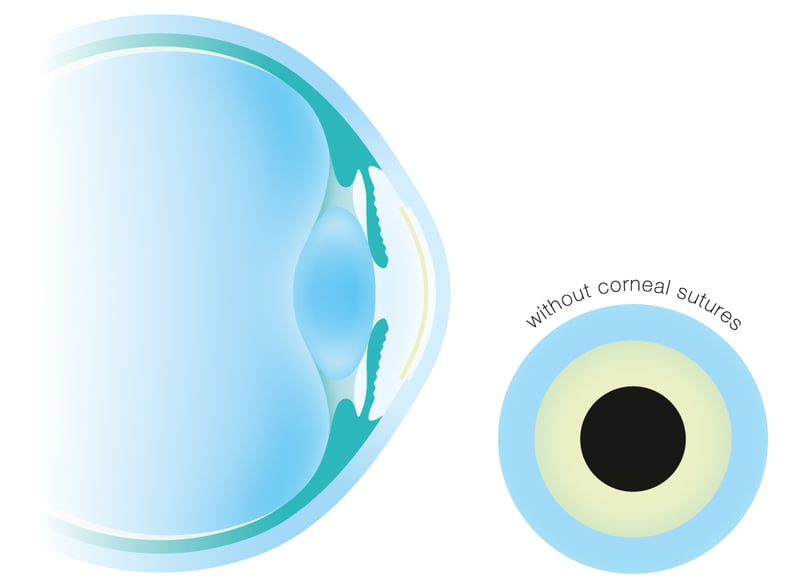 Whether the transplant is sutured with two star-shaped continuous sutures or an appropriate number of single-knot sutures is the decision of the surgeon depending on the circumstances of the individual case. The sutures used are made of nylon and are several times thinner than a human hair.